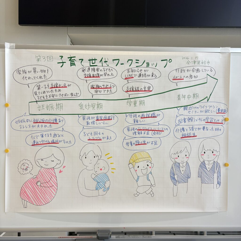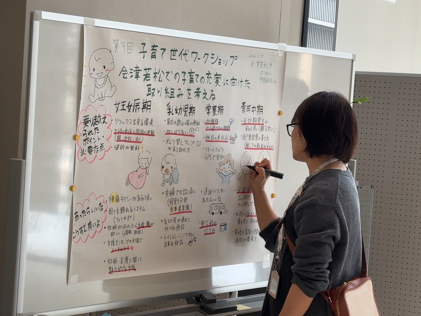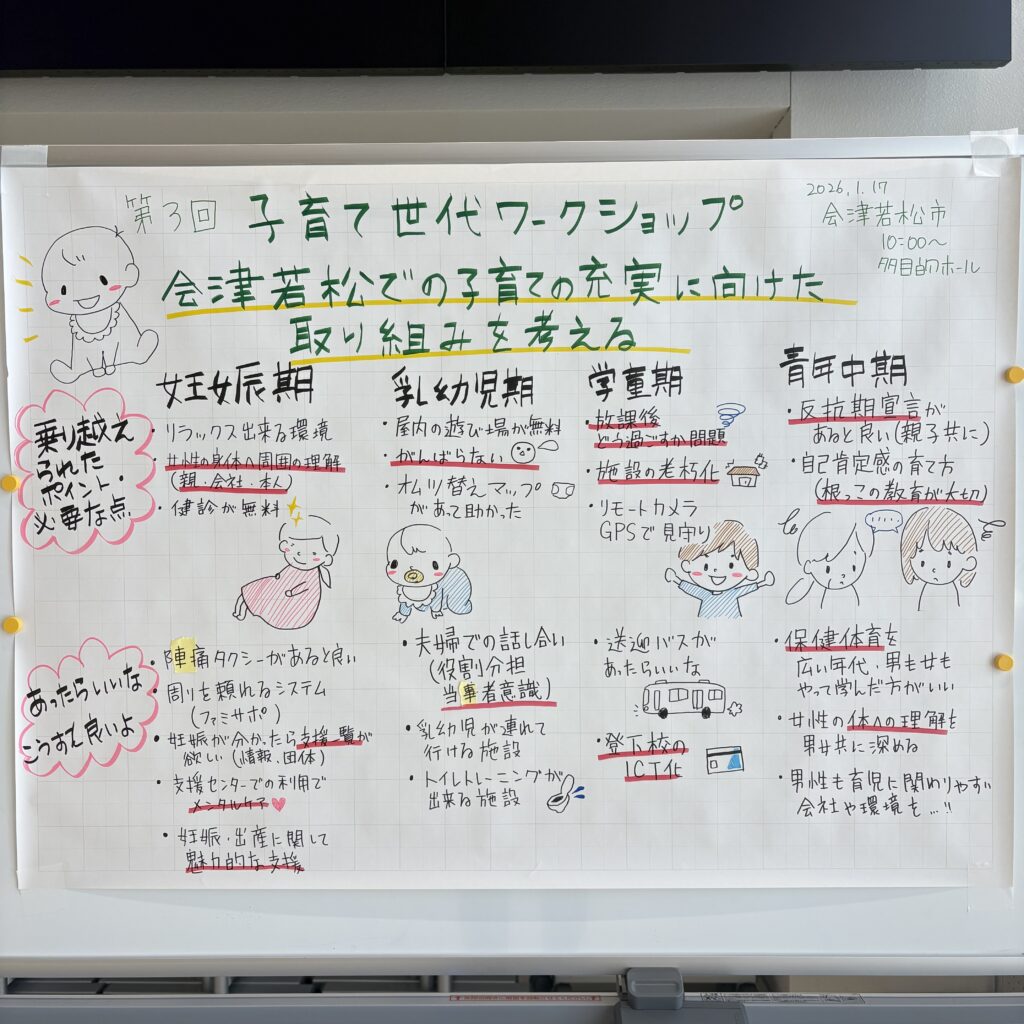 令和8年1/17に第3回子育て世代ワークショップとして、「会津若松での子育ての充実に向けた取り組みを考える」というワークショップを開催しました。